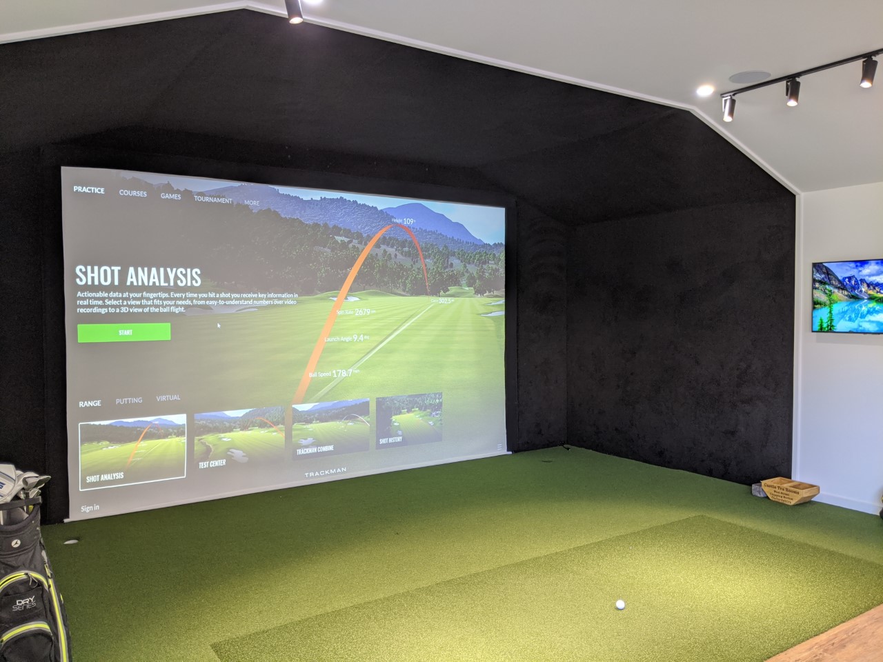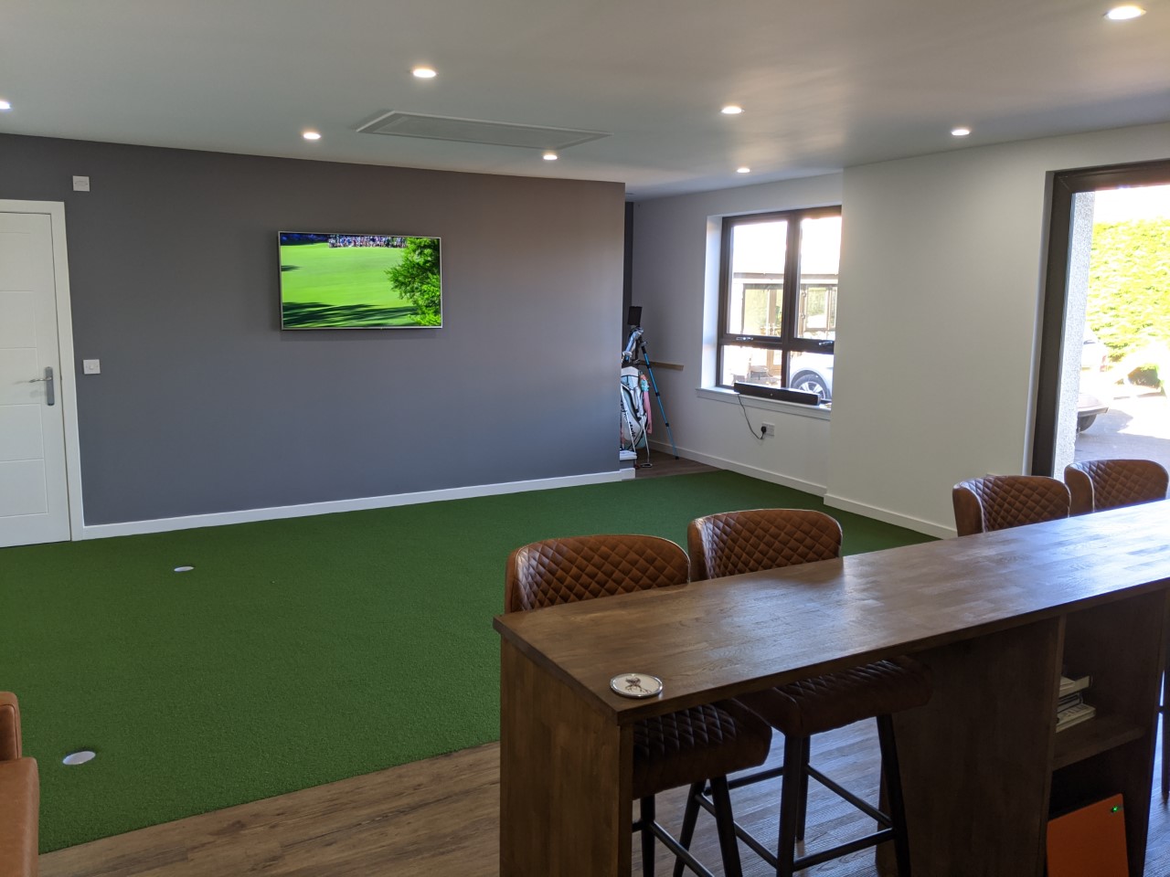 Luxury Trackman 4 golf simulator, with Huxley professional putting green area. The perfect environment to work on your swing throughout the year.